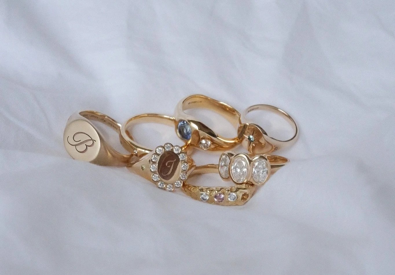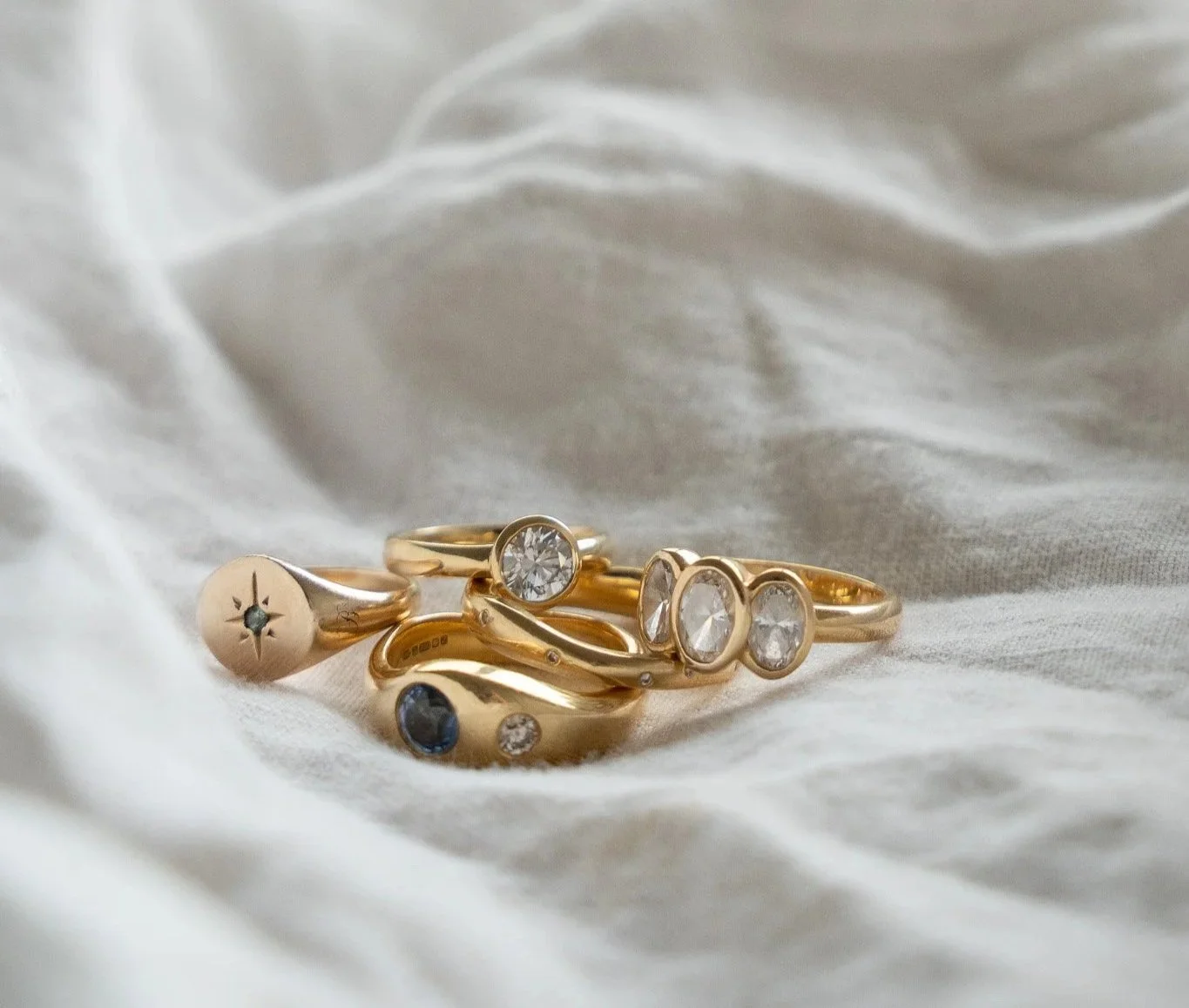 Our Fine Collection is crafted using 100% recycled 9ct yellow or rose gold, or recycled sterling silver — metals chosen for their beauty, durability, and low environmental impact. For our bespoke customers, there is complete flexibility in material choice: your piece can be made in 100% recycled or Fairmined 9ct,14ct or 18ct yellow, rose, or white gold, as well as platinum. Every option offers a balance of elegance, strength, and sustainability — allowing you to choose the precious metal that feels most personal to you.